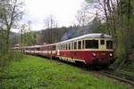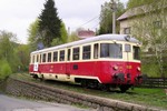 Motorový vůz 820.021 u Tanvaldu na ozubnicové trati do Kořenova 7. května 2005. (Foto: Pavel Šturm)