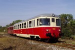 Motorový vůz 820.021 během cesty na mělnické vinobraní u Lhotky u Mělníka 20. září 2003. (Foto: Ladislav Doškář)