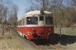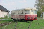 Motorový vůz M 240.046 v Úštěku během pochodu po zrušené trati Úštěk - Velké Březno 30. března 2002. (Foto: Lukáš Kaizrlík)